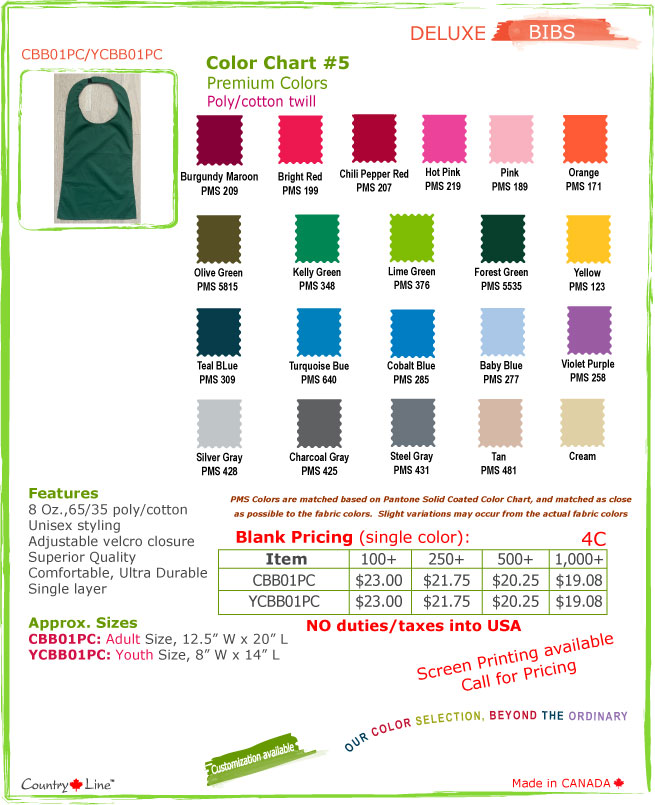 NO DUTIES/TAXES, Brokerage or Handling fees into USA Features 8 oz. 65/35 poly/cotton twill/poplin With adjustable neck closure Unisex styling, comfortable fit Ultra durable Superior Quality Customization (available at additional cost) Alter the length or width Sizing One size fits most 12.5" W x 20" H Also available in YOUTH sizes Colors Choose from 30+ colors (standard & premium) For an UPDATED color chart, click here Decoration charges additional: Embroidery: For UPDATED embroidery costs/details, click here Screen Printing: For UPDATED imprint costs/details, click here FREE PMS Color Matching of Logos Pricing for Blank product: : 4C For Virtual Catalog Page click on Mini Icon under the image Browse at Bottom of Page for Pinnies, Bandanas, Sports Towels and other Sports related items!!!