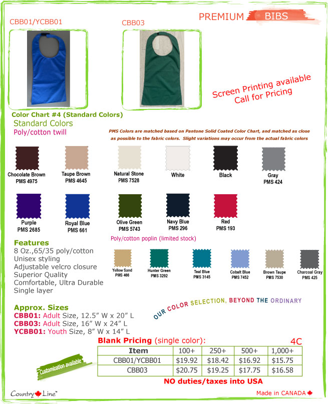 NO DUTIES/TAXES, Brokerage or Handling fees into USA Features 8 oz. 65/35 poly/cotton twill/poplin With adjustable neck closure Unisex styling, comfortable fit Ultra durable Superior Quality Customization (available at additional cost) Alter the length or width Sizing One size fits most 16" W x 24" H Also available in YOUTH sizes Colors Choose from 30+ colors (standard & premium) For an UPDATED color chart, click here Decoration charges additional: Embroidery: For UPDATED embroidery costs/details, click here Screen Printing: For UPDATED imprint costs/details, click here FREE PMS Color Matching of Logos Pricing for Blank product: : 4C For Virtual Catalog Page click on Mini Icon under the image Browse at Bottom of Page for Pinnies, Bandanas, Sports Towels and other Sports related items!!!