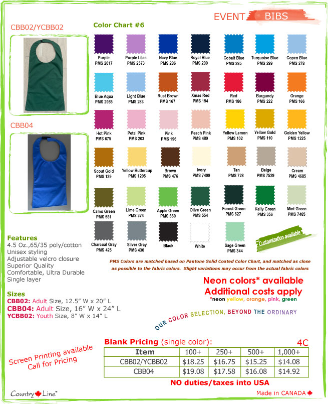 NO DUTIES/TAXES, Brokerage or Handling fees into USA Features 4.5 oz. 65/35 poly/cotton fabric With adjustable neck closure Unisex styling, comfortable fit Ultra durable Superior Quality Customization (available at additional cost) Alter the length or width Sizing One size fits most 16" W x 24" H Also available in YOUTH sizes Colors 40+ colors to choose from For an UPDATED color chart, click here Decoration charges additional: Embroidery: For UPDATED embroidery costs/details, click here Screen Printing: For UPDATED imprint costs/details, click here FREE PMS Color Matching of Logos Pricing for Blank product: : 4C For Virtual Catalog Page click on Mini Icon under the image Browse at Bottom of Page for Pinnies, Bandanas, Sports Towels and other Sports related items!!!