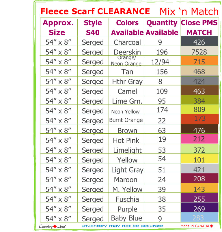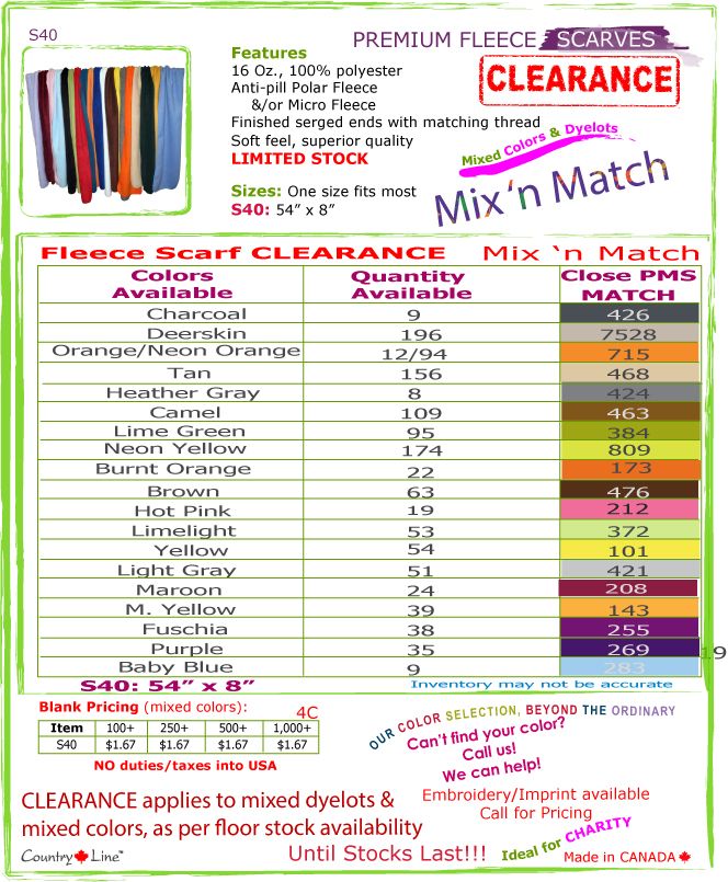 NO DUTIES/TAXES, Brokerage or Handling fees into USA Limited stock. Ideal for charities, where mixed colors is acceptable Clearance applies to mixed dyelots and mixed colors, as per floor stock availability Features 16 oz. anti-pill polar fleece, 100% polyester Finished serged ends with matching or contrast color thread to acentuate logo. Soft feel, superior quality NO ADDITIONAL CHARGE FOR CONTRAST COLOR TRIM Mix 'n Match CLEARANCE applies to mixed dyelots & mixed colors as per floor stock availability Customization (available at additional cost) Change the size, make it wider or longer Change the serged ends to tassels/fringes at both ends Serge the ends with a contrast color thread Approx. Size 54" x 8" Also available in YOUTH sizes Colors Choose from 50+ colors For an UPDATED color chart, click here Decoration charges additional: For UPDATED Embroidery costs, click here FREE PMS Color Matching of Logos Pricing for Blank product: : 4C For Virtual Catalog Page click on Mini Icon under the image Browse at Bottom of Page for Fleece Mitts, Hats, Neckwarmers, Headbands and other Fleece Accessories!!!